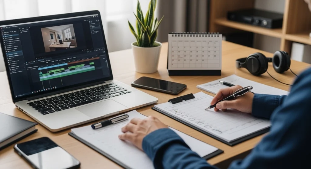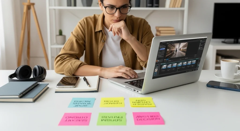 Imagem de uma rotina de trabalho organizada, com uma pessoa avaliando um vídeo no notebook e usando anotações como apoio para decidir os próximos passos.