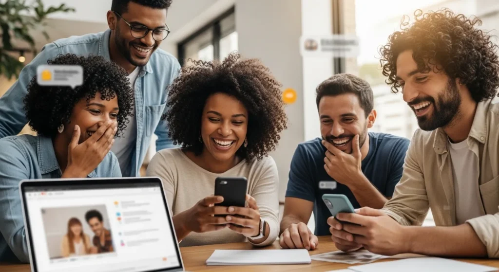 Grupo de pessoas em um ambiente casual reage com reconhecimento imediato a um conteúdo visto no celular, transmitindo a ideia de que a referência ainda circula, é compreendida e continua presente no repertório digital cotidiano.