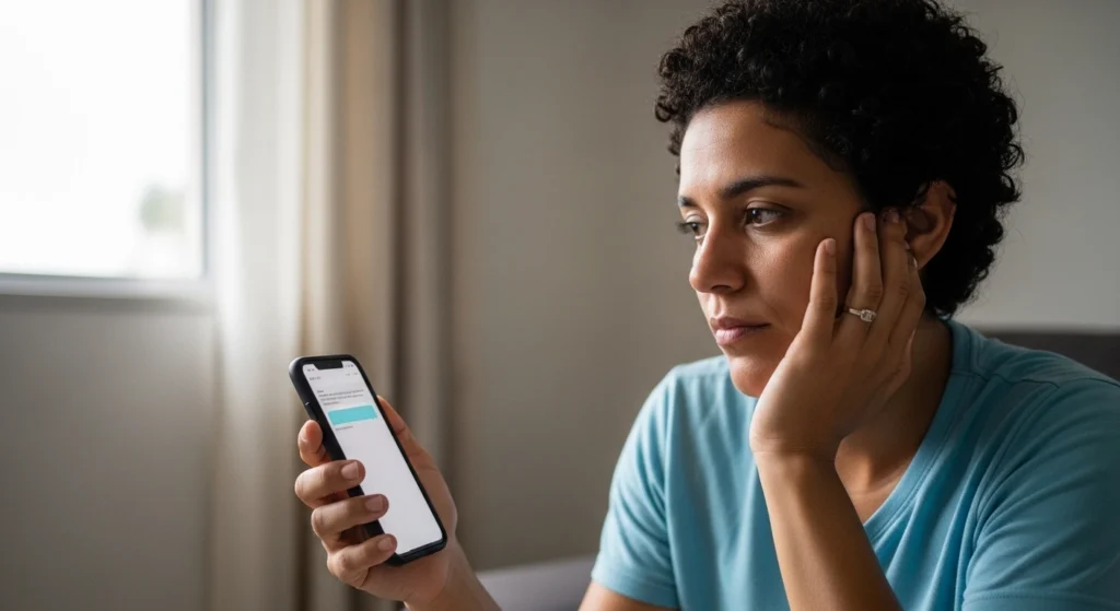 A imagem retrata um momento de pausa antes do envio de uma mensagem, destacando cuidado e reflexão.