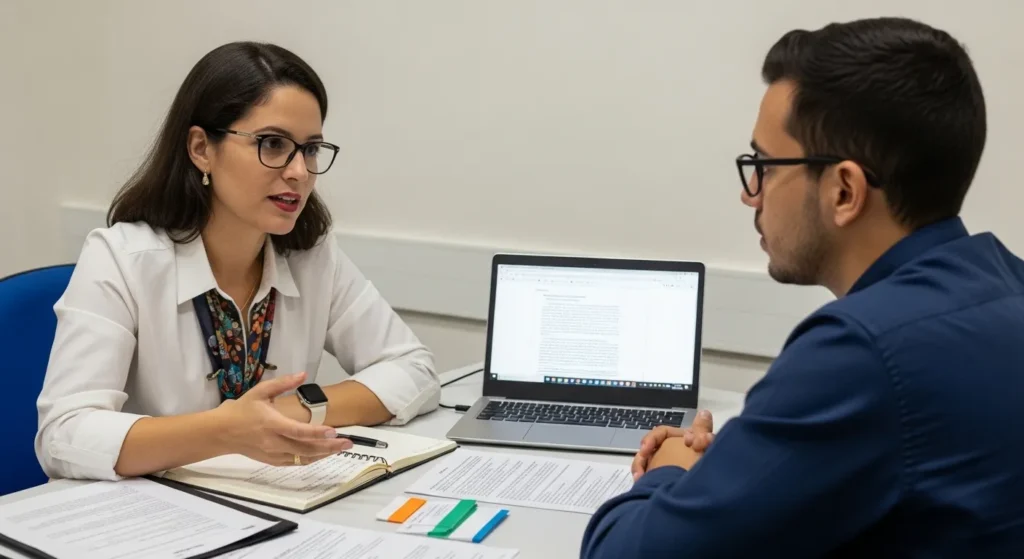 Pessoa recebendo orientação de um professor ou revisor em um ambiente calmo, representando um momento de esclarecimento e mediação cuidadosa em contexto educacional ou profissional.