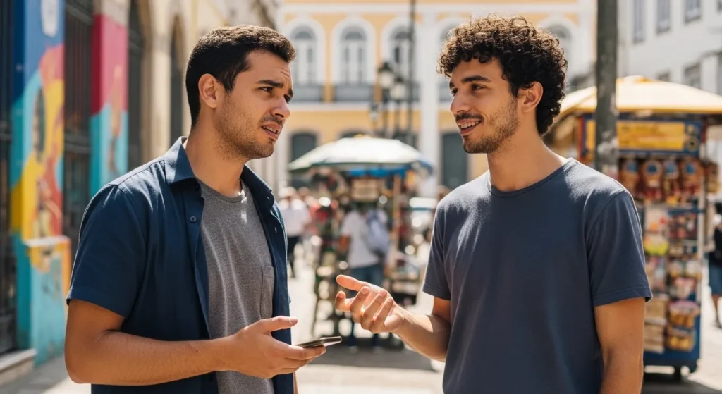 Duas pessoas em uma conversa cotidiana, em um ambiente urbano brasileiro, ilustrando o momento em que uma expressão informal é explicada de forma natural e contextual.