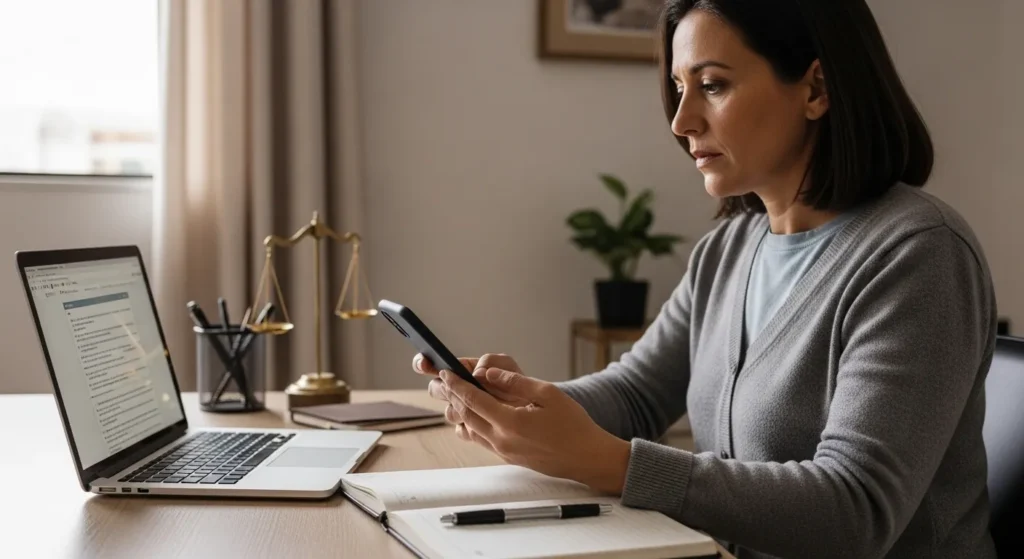 Pessoa adulta em ambiente de trabalho doméstico, observando conteúdos no notebook e no celular com postura cuidadosa antes de compartilhar.
