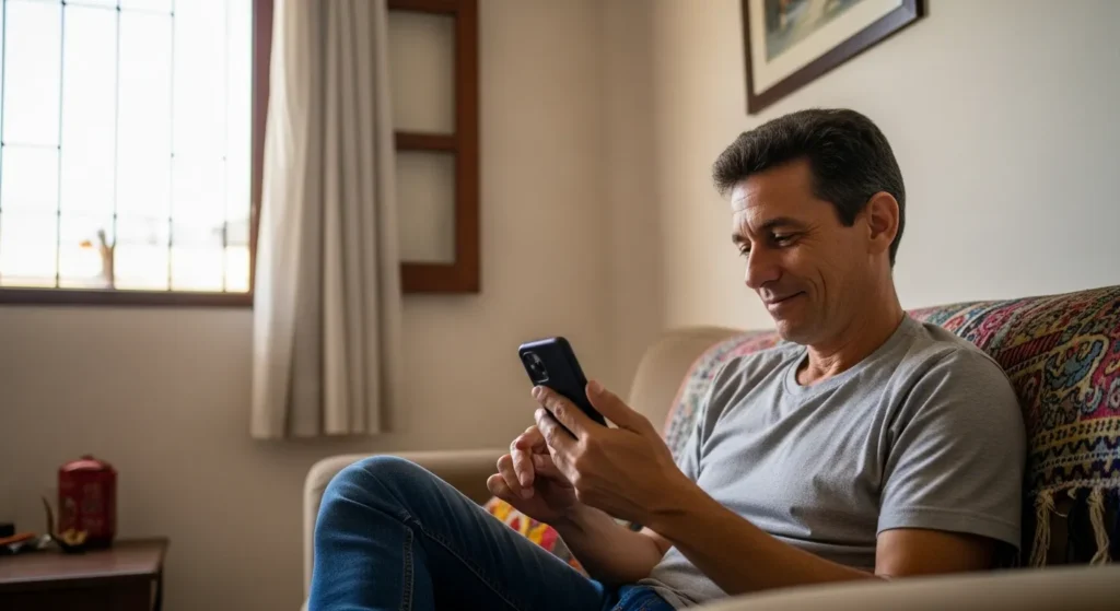 Pessoa adulta em um ambiente doméstico brasileiro, usando o celular de forma descontraída, em uma cena que transmite naturalidade e humor leve ao compartilhar um meme nas redes sociais.