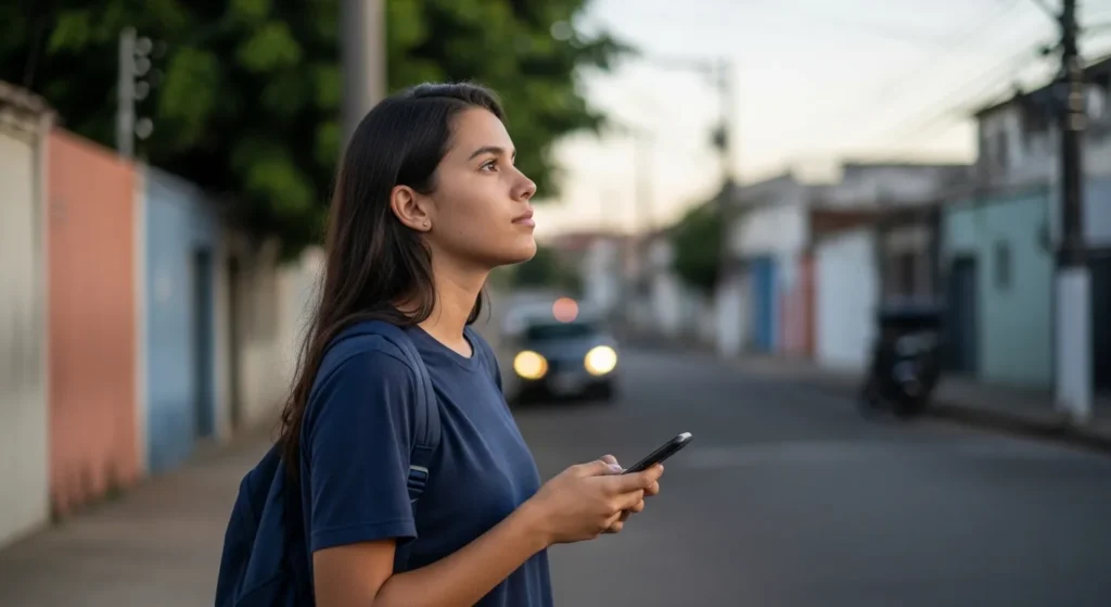 Imagem de uma pessoa jovem usando o celular em um ambiente urbano brasileiro, com expressão serena e postura relaxada.